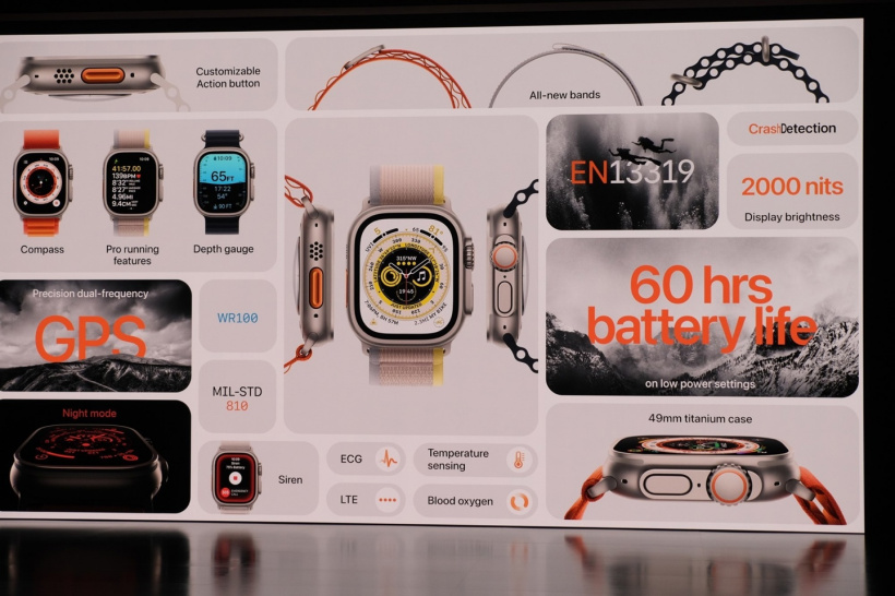 Apple Watch Ultra 还改进了多频段 GPS,其中包括新的 L5 频率。对标 Garmins 和 Coros 等健身手表。它还具有引用功能,可帮助追溯步骤,以防不小心偏离了网格。watchOS 9 中有新的指南针 应用程序,添加了指南针导航点,因此用户可以在地图上标记兴趣点。同时,对于铁人三项运动员,“操作”按钮还允许从一条赛跑过渡到另一赛段(即从游泳切换到跑步)。今年晚些时候运动员到达赛道时也会自动检测。它有 86 分贝的警报器,可以帮助其他人找到你。