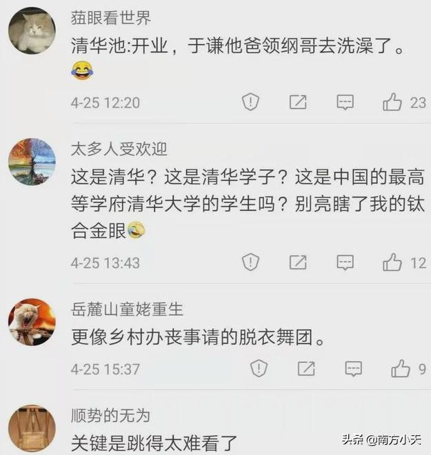 还有的持不同意见的人,说跳舞就一定要专业吗?平时学习紧张,这时候随便舞动释放压力不行吗?清华工科专业比较强,跳一些非专业非工科所长的舞蹈怎么了?更有甚者说清华学生是高等学府出来的,就算跳艳舞也文雅,即使跳广场舞也没低俗?