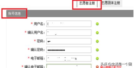 2、填写志愿者注册所需要填写的内容,其中有账号信息、个人信息、服务区域或行业。其中填写服务区域这一项时,最好填写自己所生活的区域,这样才能真正为大家服务;服务类别最好选择自己比较熟悉的。带星号的内容是必填项。