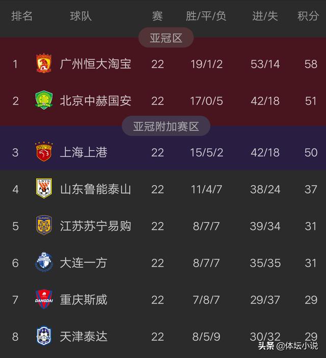 而在实时的积分榜上,恒大以58分坐稳榜首,可以说是一骑绝尘,领先第二名的国安多达7分,国安以51分排名第二,上港以50分排名第三,鲁能以37分排名第四。