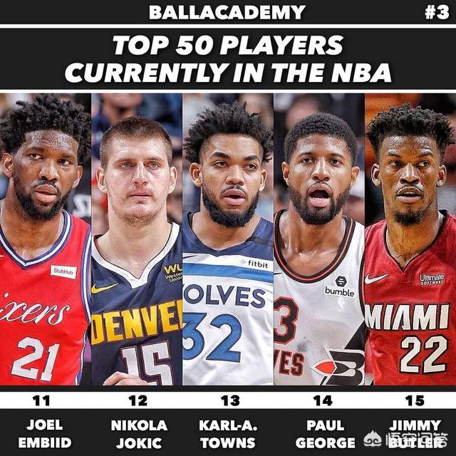 NBA现役11-15名球星:乔尔·恩比德、尼古拉·约基奇、卡尔·安东尼·唐斯、保罗·乔治、吉米·巴特勒